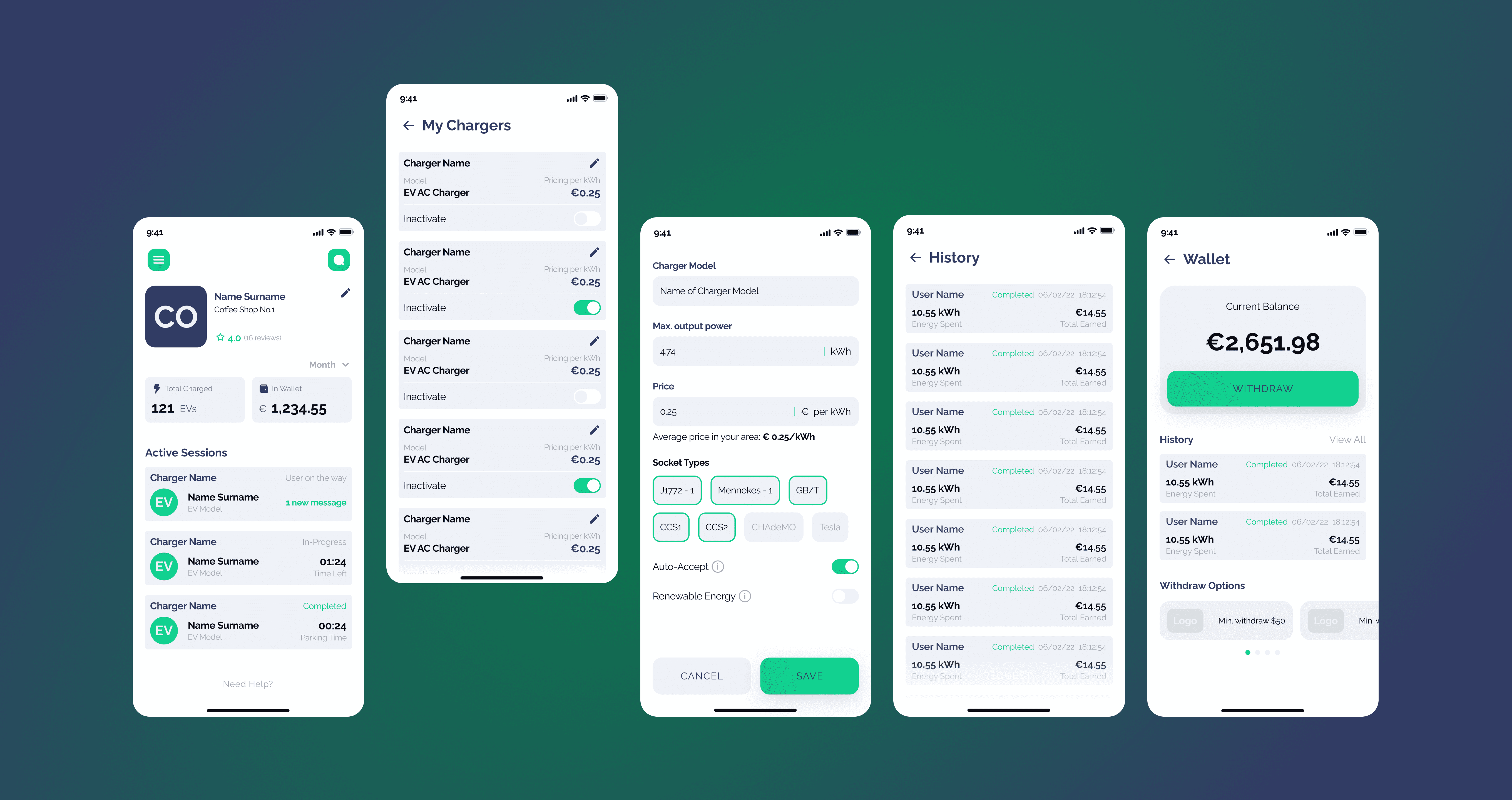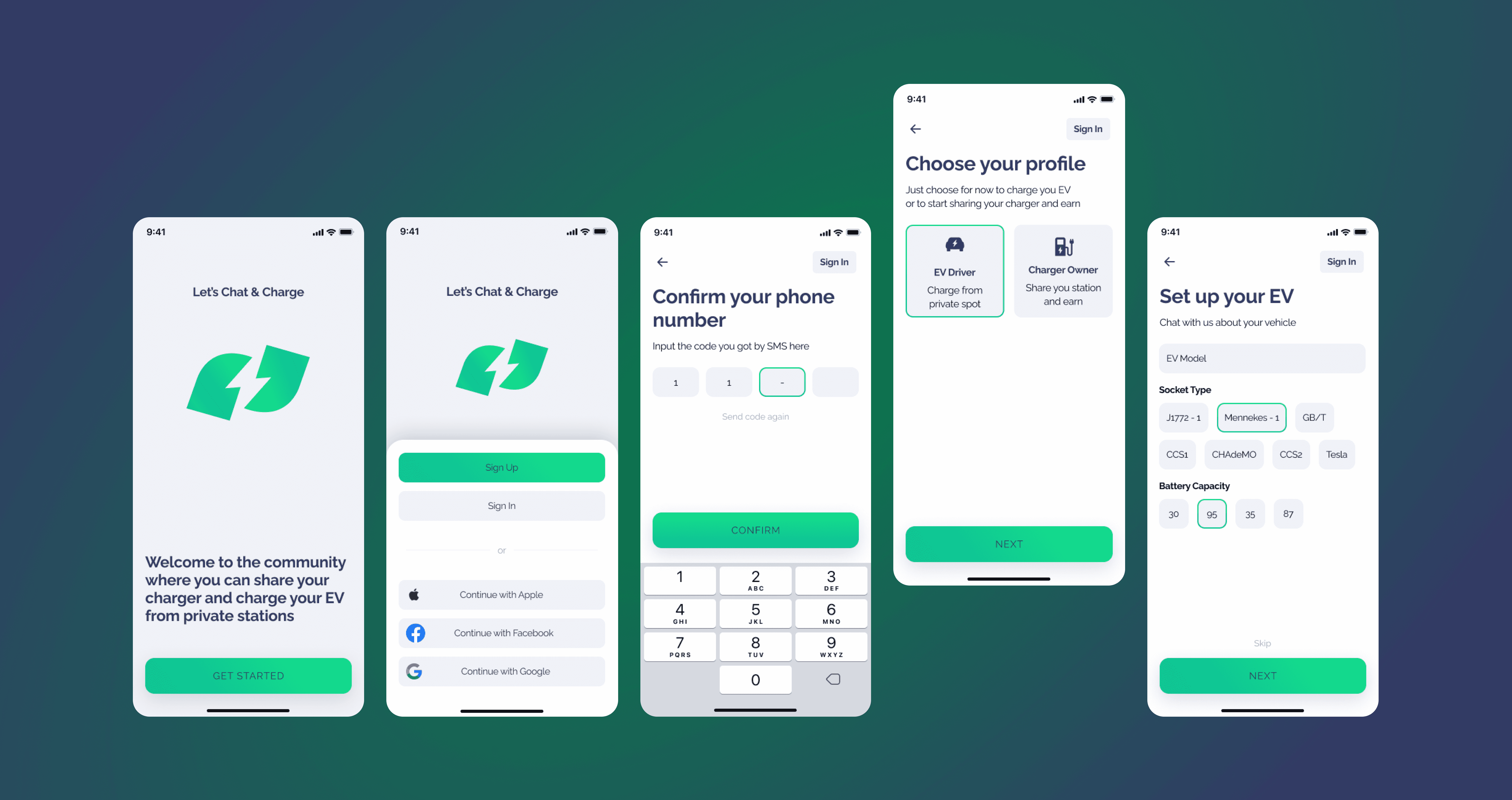 • Dual User Onboarding: Separate flows for chargers (location, specs, payment details) and drivers (personal info, payment methods)